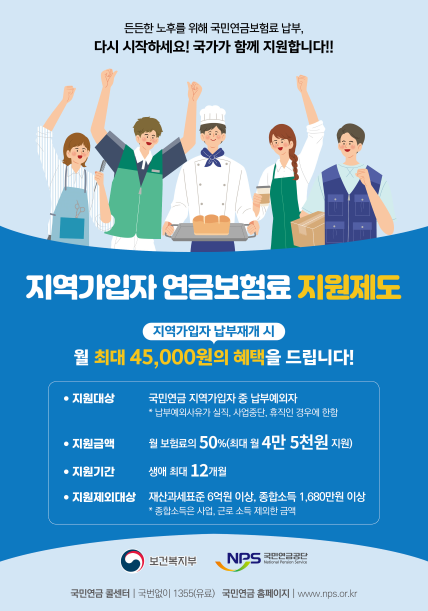 국민연금 부담금이 면제되어 보험료를 다시 납부하기 시작한 사람에게 국민연금공단에서 보조금을 지급합니다.
