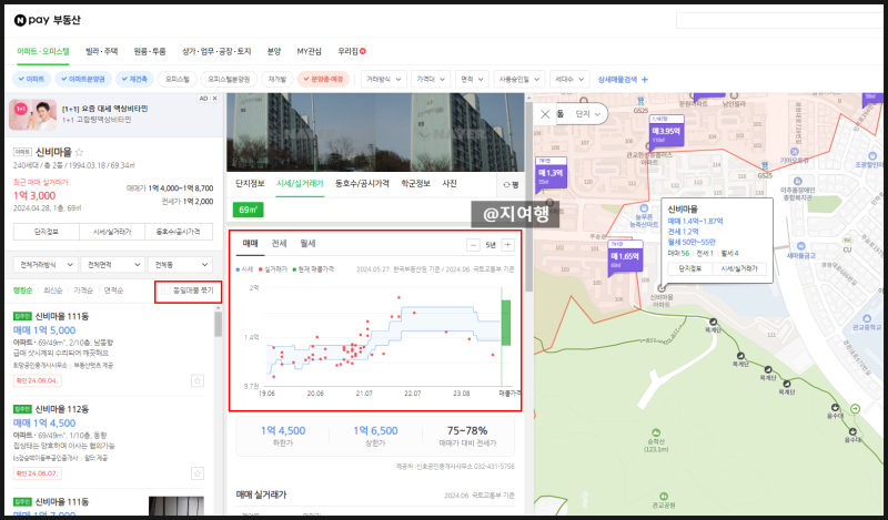 유료 경매 사이트에서 입찰할 만한 좋은 매물을 발견했다면 네이버 부동산에서 해당 매물에 대한 일반 정보를 검색할 수 있다. 가장 큰 장점은 현재 매물을 쉽게 볼 수 있다는 것이다. 각 매물 하단에 빨간색 박스로 확인 시간이 표시되어 있고, 허위 매물이 있을 경우 신고가 활성화되어 가장 정확하고 쉽게 현재 매물을 볼 수 있다. 특히, ‘동일 매물 그룹화’ 버튼이 새로 추가되어 현재 매물에 실제로 나와 있는 매물 수를 쉽게 볼 수 있다. 또한 시세/실거래가를 클릭하면 지난 몇 년간의 추이 그래프가 나와 이 단지가 갭 투기 수요에 타격을 받았는지 여부를 쉽게 알 수 있다.