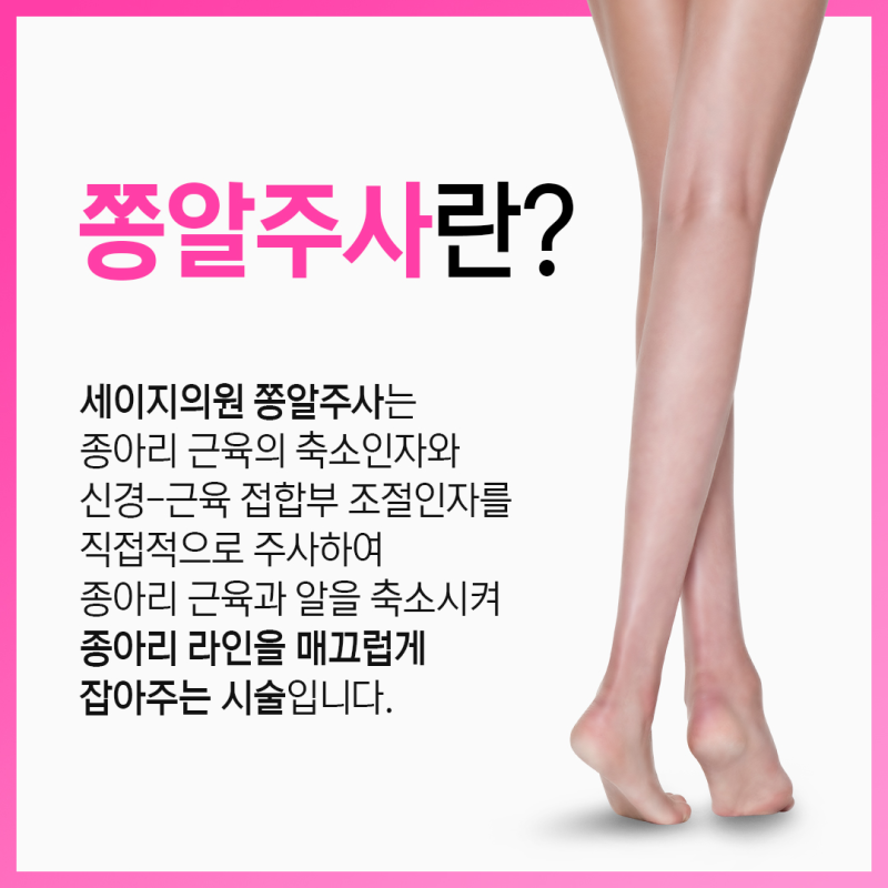 자연스럽고 매끄러운 종아리를 만들기 위해 많은 분들이 선택하고 만족하는 방법이 바로 청알주사입니다!보톡스 시술 후 내성 발생, 기타 하체성형(종아리퇴축술 등)으로 인해 후유증이나 부작용이 나타난 분들도 투덜투덜 주사를 놓을 수 있어 다행이지만 우리 몸이기 때문에 더욱 소중히 여겨야 합니다.