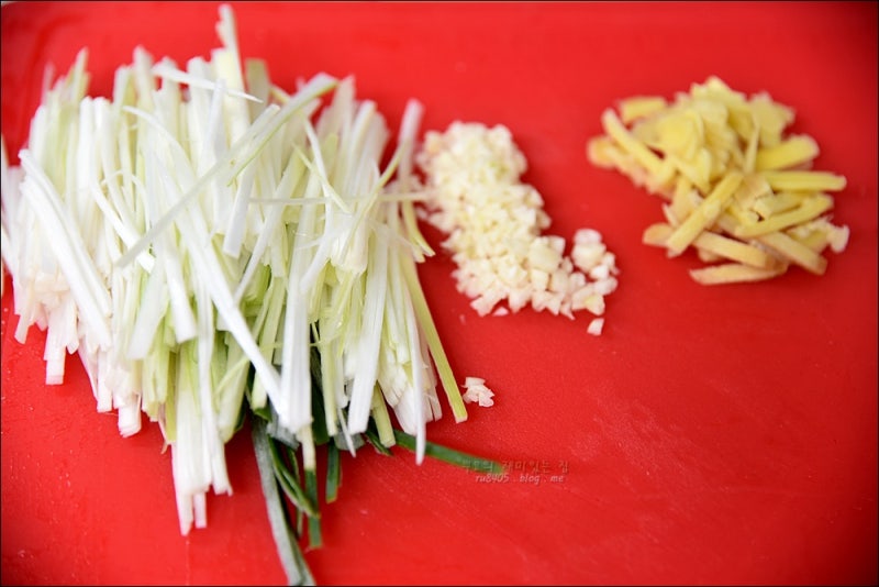 쪽파는 흰부분만 채썰고 생강은 채썰어주세요. 다진마늘을 준비합니다. . . .