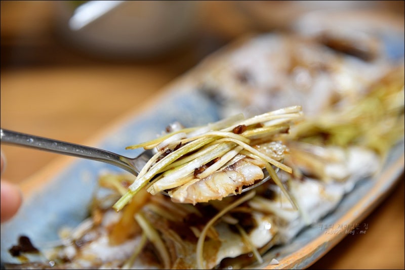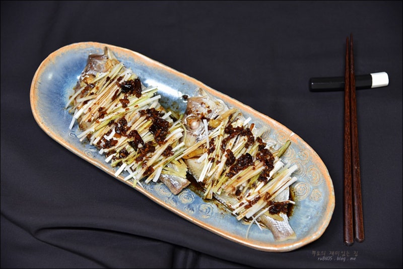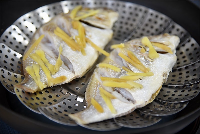 생선찜 재료: 도미반말 2마리, 생강채 2큰술, 대파 2쪽, 양념: 식용유 2큰술, 다진마늘 1/2큰술, 후추 2~3개, 다진마늘 1큰술 간장 1 1/2, 막걸리 1큰술, 설탕 1/2작은술, 참기름 1/4작은술