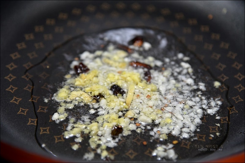 간장 1 1/2큰술, 청주 1큰술, 설탕 1/2작은술, 참기름 1/4작은술을 넣고 끓인다. 팬이 너무 뜨거우면 마늘이나 생강이 탈 수 있으니 약하게 해주세요.